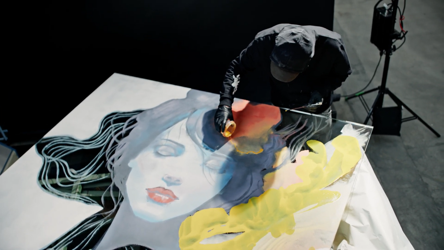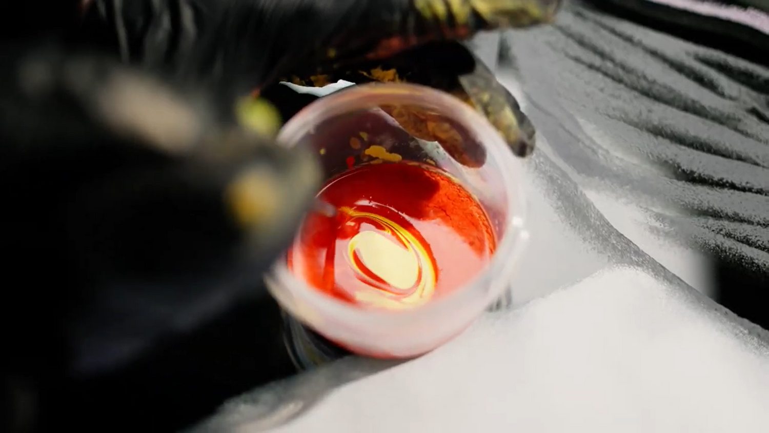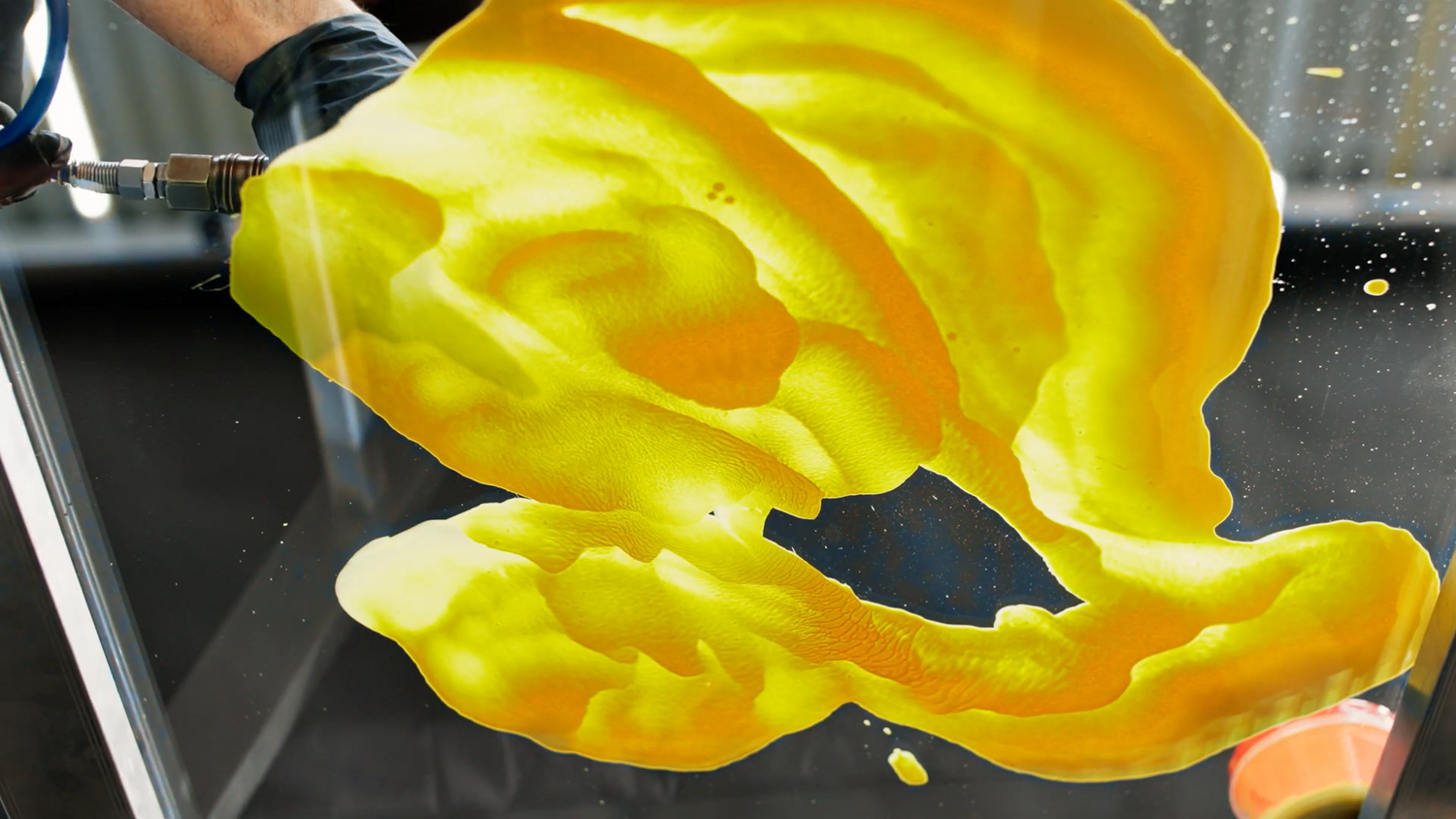 Eine Technik mit Druckluft wird eingesetzt, um die Farbe auf das Glas zu sprühen. Die feinen, diffusen Effekte entstehen durch die kontrollierte Verteilung der Farbe, wodurch faszinierende Muster und unterschiedliche Durchlässigkeiten entstehen.